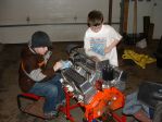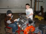 So I had picked up an engine dolly from Northern Tool. Just a crap unit that the engine sits on the balancer and pan. Picked up an engine crate from 67SS aka Chris to drop the engine in it and guess what. The new Moroso oil pan with the extra capacity will not fit in the crate without damage to the pan. So I still need to find a new engine dolly and get that thing out of the way. At least the 2 boys are doing a little polish on it so it shines.