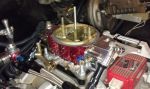 Holley 800 cfm carb.  Car started right away today with this carb on it.  Ran summer 2011 and ran great (1200 miles) on rebuild.  Dyno guy suggested I switch to something smaller for next year.  Dyno tuned on the car 7/2011.  Red main body, chrome bowls, mechanical secondarys.  Picture attached below.