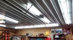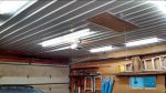 Made some more progress today, got about 50% of the ceiling tin up with Jr's & Sheryl's help, and mounted the 1st string of lights. I've already pre-located the feeder drops for the lighting circuits, and they'll through the ceiling into the fixtures with a short nipple (nothing exposed).