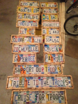 Custom made signs using license plates. See attached pic for examples. You tell me what you want--year/make/model, etc. I have all letters and and try to use only one state per plate (I have a good collection of states), but I can also do ones with all one state using Minnesota, all California, all Iowa, or all Texas, maybe others depending on letters needed. I have paired numbers for years ie: 66, 72, etc. and can do spaces, - . and * characters too. Frame is wood and distressed, then fire scorched. $4 per letter/number/character, frame is free. Addresses, phrases, mancave slogans, etc are all do-able.