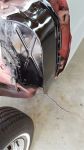 When I removed the fenders prior to taking the body off the frame I found this surprise. The drivers side cowl shoulder had suffered damage in its earlier life. I could have left it that way, once the fenders installed it would never show, but it was a training opportunity I couldn't pass up, if I really muffed it up I'd just stick the fender back on.
