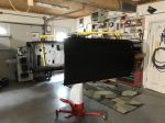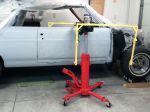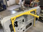I've reached the point where the doors will be going on and off the body several times for fitment, alignment, block sanding, painting and finial assembly. After researching available door dollies and stands I sketched out a door dolly that adapts to my transmission jack. The transmission jack affords pitch and roll in two axis plus up and down, I added a couple more adjustment, twist and bend; this will allow me to dry fit and mark the hinges prior to final installation. If one is good two must be better and their reversible, that is the door can be mounted facing in or out. In for tweeking and installation out for painting.