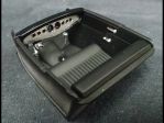 I hogged out the (as molded) dashboard, leaving a thin rim with the column support intact. Using this, made a paper template of the "aluminum" insert panel. This panel was glued to a slightly larger "backer" piece (same contour), so when put behind the dashboard, the face-piece would appear to be an insert. The insert layed out and drilled with eight, 2mm holes for the gauges.