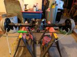 Rear end is all together with brakes and drums. I did end up using drums for a 73 Chevelle wagon the impala drums did not have a deep enough offset to cover the brake shoes completely. All the control arm bushings are pressed in and ready to go. Getting very close to bringing the car up to start tearing it apart.