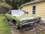 1968 Impala Custom Coupe (16447), built in January 1968 in Flint Michigan and sold through a dealer in Chicago to a single woman. Shortly after purchase she moved to Arizona and registered it there in July 1968 with 3,021 miles on the odometer. It lived it's life in the Phoenix area. My friend who lives south of Tucson bought the car around 2013. It is Seafrost Green in color with a black vinyl top and a cloth gray and green interior. The engine is a 327 with a Rochester 4 barrel with single exhaust. It is either a 250HP L73 or a 275HP L30. It has either a TH350 or TH400 transmission I have not verified which. If it is a TH350 it is a COPO engine code 9665. The car is all original. The interior has had seat covers for many years but there is wear on the front seat. The trunk lid was damaged and has been repainted in modern color/clear coat as shown in the photos. There is a scratch on the drivers side from hitting a mail box. It is a running vehicle but I can't guarantee how far it could/should be driven at this point. I have seen the car and actually did some carb work on the car several years ago. For not having any restoration done on it the vehicle is in amazing shape for it's age. Not perfect but nice. The rocker panels seem solid. The trunk floor has some rust along the wheel wells but nothing too extensive. I have not lifter the carpet to verify the floor condition.The current odometer is 56,547 miles. The owner has a good title in his name.